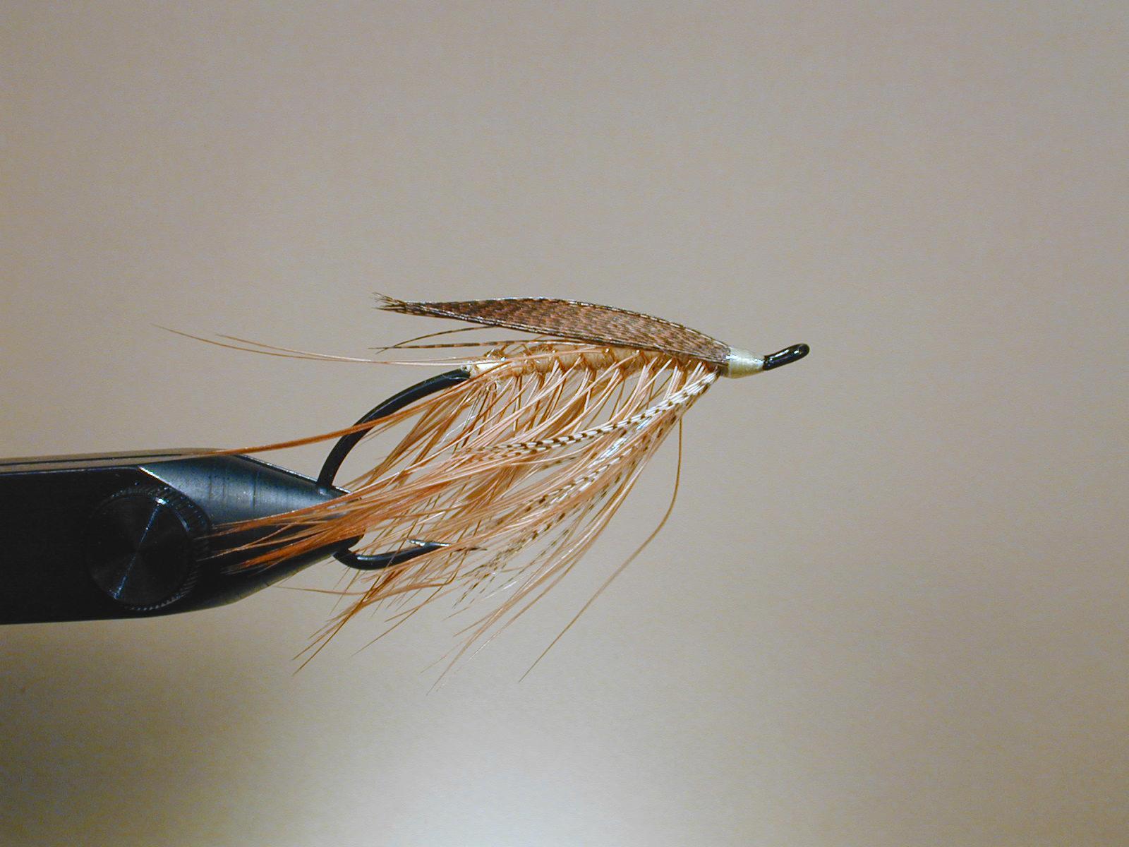 | | Hackle: | light brown Spey cock substitute, tied in at the front,